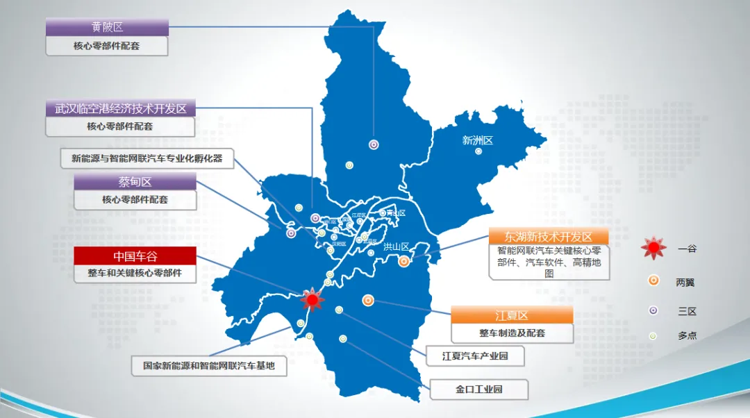 武漢市“一谷兩翼”產(chǎn)業(yè)格局奠定基礎(chǔ),其中經(jīng)開區(qū)“中國車谷”為整車制造及技術(shù)研發(fā)核心,江夏、東湖新技術(shù)開發(fā)區(qū)為關(guān)鍵零部件及配套設(shè)施的動力支撐。重點(diǎn)布局新能源與智能網(wǎng)聯(lián)汽車創(chuàng)新產(chǎn)業(yè)園、車規(guī)級芯片產(chǎn)業(yè)園、光谷智能網(wǎng)聯(lián)汽車軟件產(chǎn)業(yè)園、智能網(wǎng)聯(lián)智造園等重點(diǎn)園區(qū)載體,大力發(fā)展整車制造+三電系統(tǒng)、車規(guī)級芯片、汽車軟件及高精地圖、智能網(wǎng)聯(lián)汽車零部件等產(chǎn)業(yè)。同時聯(lián)動“三區(qū)多點(diǎn)2”,打造臨空港汽車產(chǎn)業(yè)園、中德國際產(chǎn)業(yè)園、新能源汽車十里長廊等一批具有特色功能的重點(diǎn)園區(qū),提升產(chǎn)業(yè)韌性。