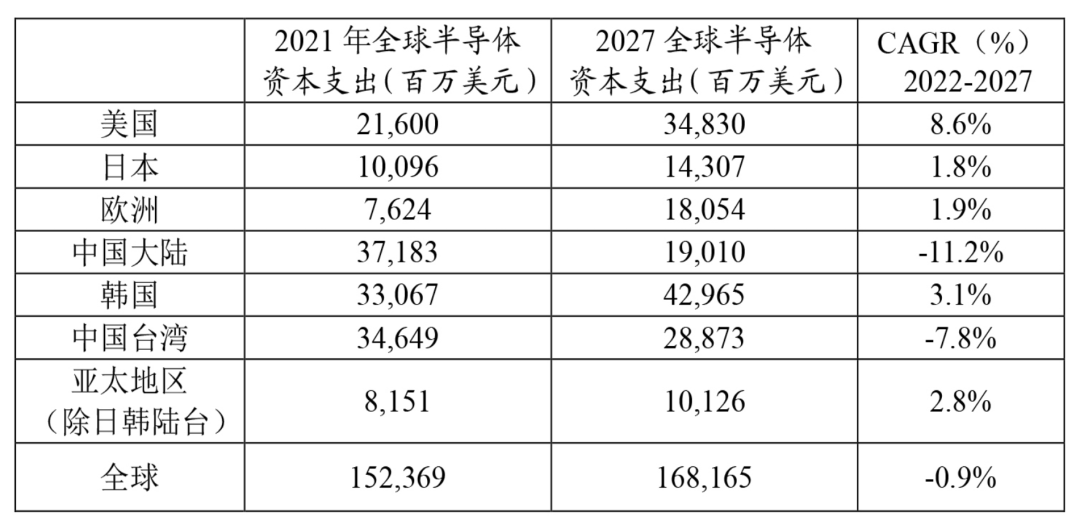 隨著美國、日本等國不斷加強半導體設備等關鍵產品的出口管制力度和范圍,導致全球半導體制造業及供應鏈體系“去中國化”的趨勢愈加凸顯。從全球新增晶圓廠數據來看,2018年全球僅有4個國家或地區新建晶圓廠(中國17個、中國臺灣、德國、韓國各1個),在中國新建廠數量占比達到85%。而到2023年這一數字降到了13%,并且近兩年在全球13個國家或地區都有新建晶圓廠的布局(見圖1)。由此可見,全球新建晶圓廠不再以中國為中心。從國際市場機構Gartner對未來5年全球半導體資本支出區域分布的預測數據來看,2021-2027年中國大陸的半導體資本支出將下滑最多,CAGR達到-11.2%(見表2)。美國、韓國、亞太地區(除日韓、中國的大陸和臺灣地區外)將成為未來幾年全球半導體資本支出增加較多的重點區域。