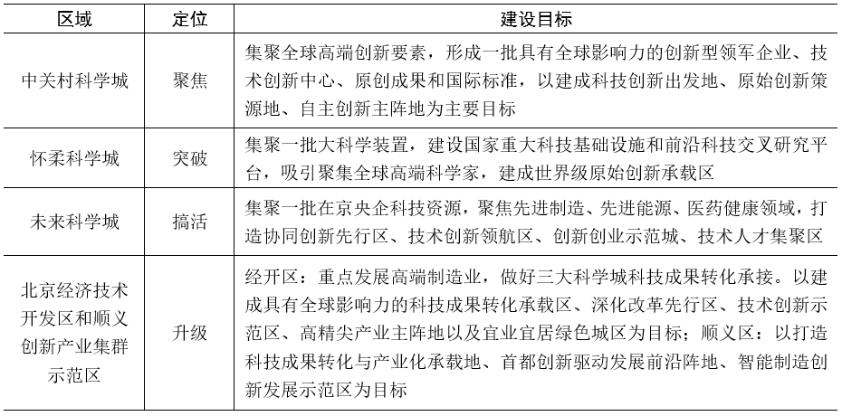 當前我國面臨錯綜復(fù)雜的國際形勢,國際科技創(chuàng)新合作面臨巨大挑戰(zhàn)。“三城一區(qū)”作為國際科技交流與合作的承載地、國際科技創(chuàng)新中心建設(shè)的主平臺,科技創(chuàng)新資源高度集聚,政策疊加優(yōu)勢尤為突出,加快推動“三城一區(qū)”統(tǒng)籌聯(lián)動和融合發(fā)展,促進各區(qū)優(yōu)勢互補,強化創(chuàng)新鏈、產(chǎn)業(yè)鏈和供應(yīng)鏈協(xié)同共生,對北京建設(shè)科技創(chuàng)新之城、爭先競逐世界高地意義重大。本文將從“三城一區(qū)”融合聯(lián)動發(fā)展現(xiàn)狀入手,剖析融合聯(lián)動發(fā)展存在的問題,并研提對策建議,以期為推動“三城一區(qū)”融合聯(lián)動向縱深發(fā)展提供支撐。 一、“三城一區(qū)”融合聯(lián)動成效初顯,問題仍存 目前,“三城一區(qū)”融合聯(lián)動發(fā)展取得初步成效,協(xié)調(diào)對接機制初步形成、聯(lián)動發(fā)展分工定位逐步明確、社會組織驅(qū)動聯(lián)動合作日益增多,但仍然存在頂層設(shè)計亟需優(yōu)化、協(xié)調(diào)力度有待提升、優(yōu)勢互補尚未達成、協(xié)同創(chuàng)新合作不足等諸多問題。 (一)組織架構(gòu)搭建完成,運行機制尚待優(yōu)化 為支撐北京國際科技創(chuàng)新中心建設(shè),北京市設(shè)立“一處七辦”[1]組織架構(gòu),北京推進科技創(chuàng)新中心建設(shè)辦公室秘書處(以下簡稱“北京辦公室秘書處”)負責(zé)北京辦公室日常工作,7個專項辦各司其職,負責(zé)具體推進各專項工作,覆蓋重大科技戰(zhàn)略落實、政策創(chuàng)新改革、科技人才建設(shè)等重點領(lǐng)域,涵蓋“三城一區(qū)”科技創(chuàng)新主平臺。但由于“一處七辦”缺乏實體領(lǐng)導(dǎo)機構(gòu),專項辦主要依托相關(guān)市屬委辦局、各區(qū)政府工作體系運轉(zhuǎn),凝聚力有待加強。 (二)協(xié)調(diào)機制初步建立,協(xié)調(diào)力度有待提升 北京辦公室秘書處牽頭建立了協(xié)調(diào)會議機制,包括周例會、季度調(diào)度會及半年度調(diào)度會等形式,為“三城一區(qū)”搭建了溝通交流平臺。“三大科學(xué)城”與“一區(qū)”簽訂戰(zhàn)略合作協(xié)議,各單位相應(yīng)建立工作專班或領(lǐng)導(dǎo)小組,初步探索建立了聯(lián)動發(fā)展機制。但“三城一區(qū)”尚無市級層面領(lǐng)導(dǎo)機構(gòu),聯(lián)動層級不夠,工作協(xié)調(diào)力度不足,不能有效地解決“三城一區(qū)”融合聯(lián)動發(fā)展中出現(xiàn)的深層次問題。 (三)聯(lián)動分工初步明確,優(yōu)勢互補尚未達成 北京市根據(jù)“三城一區(qū)”創(chuàng)新資源、產(chǎn)業(yè)特點、發(fā)展方向等方面,明確了“三城一區(qū)”具體發(fā)展定位及建設(shè)目標(見表1),但“三城一區(qū)”融合水平尚需提升,目前并未在聯(lián)動基礎(chǔ)上充分發(fā)揮“三城一區(qū)”各自的優(yōu)勢力量,創(chuàng)新鏈、產(chǎn)業(yè)鏈難以形成有效銜接,創(chuàng)新資源優(yōu)勢尚未充分轉(zhuǎn)化為產(chǎn)業(yè)優(yōu)勢。 表1 北京市“三城一區(qū)”各區(qū)域規(guī)劃發(fā)展定位