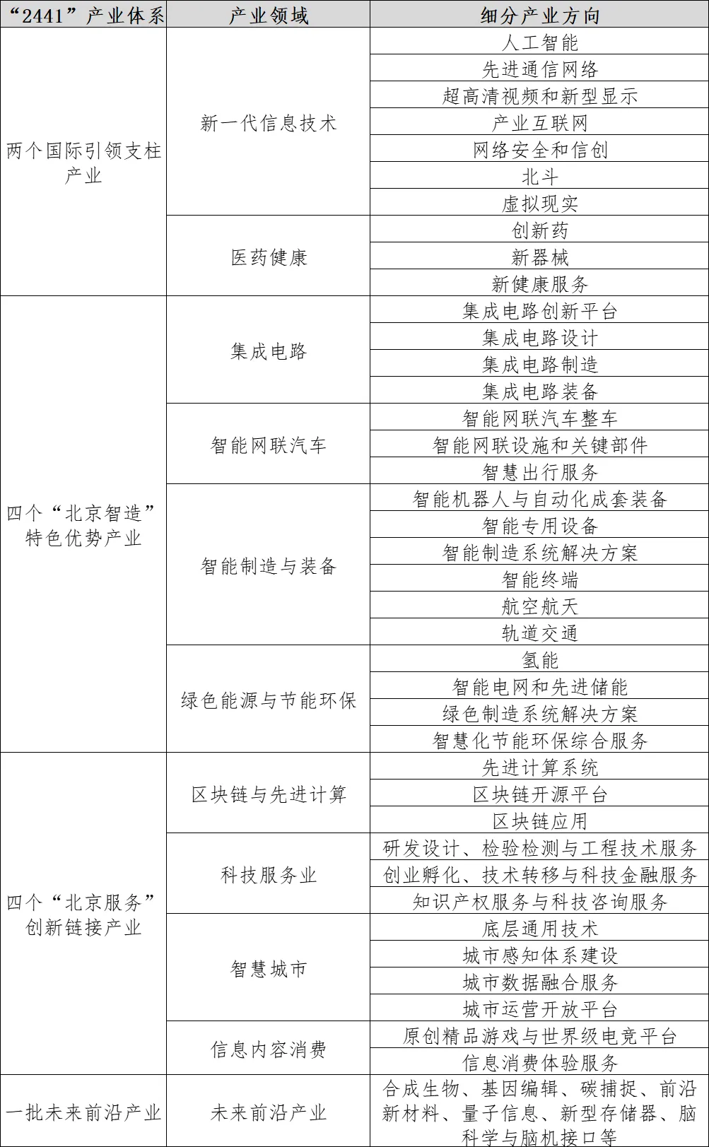 北京市高精尖產業體系以新一代信息技術、醫藥健康等重點產業領域為基底,并在政策設計中,逐步明確各產業領域的重點細分方向,以作為推動產業能級提升和結構優化的抓手。具體細分方向情況如下。