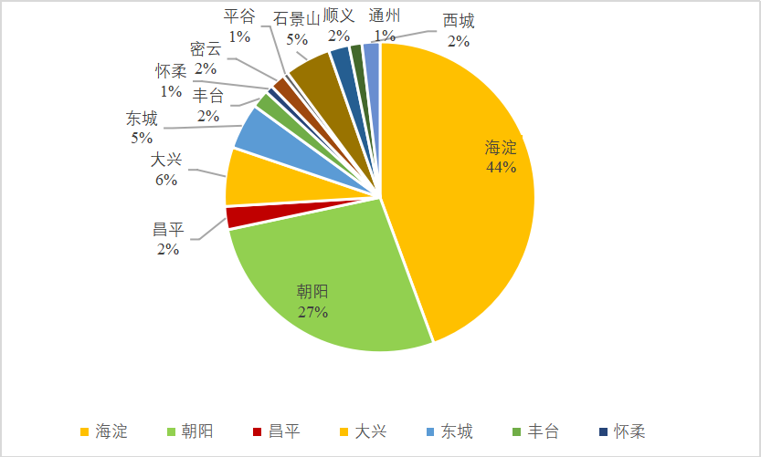圖1 2019-2022年北京市數(shù)字經(jīng)濟(jì)增加值及占GDP比重 (二)創(chuàng)新上成效顯著 北京市高度重視創(chuàng)新,平臺(tái)經(jīng)濟(jì)領(lǐng)域的創(chuàng)新投入逐年增長(zhǎng),并形成一批創(chuàng)新成果。一是平臺(tái)企業(yè)研發(fā)投入強(qiáng)度加大。2022年北京市平臺(tái)企業(yè)研發(fā)投入強(qiáng)度約15%,遠(yuǎn)高于全市研發(fā)經(jīng)費(fèi)投入強(qiáng)度6%的水平。其中,信息資訊類平臺(tái)、社交娛樂(lè)類平臺(tái)、計(jì)算應(yīng)用類平臺(tái)等研發(fā)投入強(qiáng)度超20%。二是平臺(tái)企業(yè)在5G、大數(shù)據(jù)、云操作系統(tǒng)、分布式數(shù)據(jù)庫(kù)、區(qū)塊鏈、智能算法、金融科技等領(lǐng)域積極進(jìn)行核心關(guān)鍵技術(shù)研發(fā)并開(kāi)展前沿技術(shù)探索,上線首個(gè)超導(dǎo)量子計(jì)算云平臺(tái),發(fā)布國(guó)內(nèi)首個(gè)自主可控區(qū)塊鏈平臺(tái)“長(zhǎng)安鏈”。部分領(lǐng)先企業(yè)發(fā)揮“頭雁效應(yīng)”,參與建設(shè)算力等新型基礎(chǔ)設(shè)施,推動(dòng)自主技術(shù)規(guī)模化應(yīng)用。如抖音成立人工智能實(shí)驗(yàn)室,集中研究機(jī)器學(xué)習(xí)、自然語(yǔ)言處理、計(jì)算機(jī)視覺(jué)、人機(jī)交互等前沿技術(shù);百度推出云端全功能AI芯片“百度昆侖”及元宇宙產(chǎn)品“希壤”,以VR技術(shù)為基礎(chǔ),為行業(yè)提供云智一體的元宇宙基礎(chǔ)設(shè)施平臺(tái)。 (三)空間上集聚發(fā)展 統(tǒng)計(jì)數(shù)據(jù)顯示,北京市重點(diǎn)監(jiān)測(cè)平臺(tái)企業(yè)集聚在海淀區(qū)及朝陽(yáng)區(qū),兩區(qū)合計(jì)占比超七成。從企業(yè)數(shù)量看,海淀區(qū)集聚抖音、快手、百度、美團(tuán)、貝殼、58、愛(ài)奇藝、新浪等多家頭部平臺(tái)企業(yè),占全部監(jiān)測(cè)平臺(tái)企業(yè)的44%以上;朝陽(yáng)區(qū)集聚阿里、美團(tuán)、58、360等多家頭部互聯(lián)網(wǎng)平臺(tái)企業(yè),占全部監(jiān)測(cè)平臺(tái)企業(yè)的27%以上。此外,大興區(qū)集聚京東、本來(lái)生活、小笨鳥跨境平臺(tái)等企業(yè),占全部監(jiān)測(cè)平臺(tái)企業(yè)的6%以上,形成電商企業(yè)集聚發(fā)展帶動(dòng)產(chǎn)業(yè)的創(chuàng)新格局。從涵蓋領(lǐng)域看,北京平臺(tái)經(jīng)濟(jì)主要分布在出行服務(wù)、電子商務(wù)、生活服務(wù)、游戲動(dòng)漫、信息資訊、教育培訓(xùn)、金融、科技等領(lǐng)域,基本涵蓋網(wǎng)絡(luò)銷售類平臺(tái)、生活服務(wù)類平臺(tái)、社交娛樂(lè)類平臺(tái)、信息資訊類平臺(tái)、金融服務(wù)類平臺(tái)、計(jì)算應(yīng)用類平臺(tái)等六大類型。