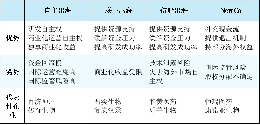 與海外醫(yī)藥市場相比較,我國本土支付能力和定價空間有限,企業(yè)利潤回報相對較少,倒逼企業(yè)尋求海外市場盈利空間。同時,我國創(chuàng)新藥企自主研發(fā)實力逐漸與國際領(lǐng)先水平接軌,截至目前,我國創(chuàng)新藥臨床試驗和上市數(shù)量穩(wěn)居全球第二,CAR-T、ADC、siRNA以及PD-1/PD-L1等尖端領(lǐng)域表現(xiàn)亮眼,超30款創(chuàng)新藥成功出海,創(chuàng)新藥產(chǎn)業(yè)格局從“輸入”轉(zhuǎn)變?yōu)?ldquo;輸出”。在這一過程中,本土藥企從戰(zhàn)略布局、資本實力及海外商業(yè)化運營能力等多方面綜合考慮,探索形成了自主出海、聯(lián)手出海、借船出海、NewCo等多樣化模式,全面走向全球市場。