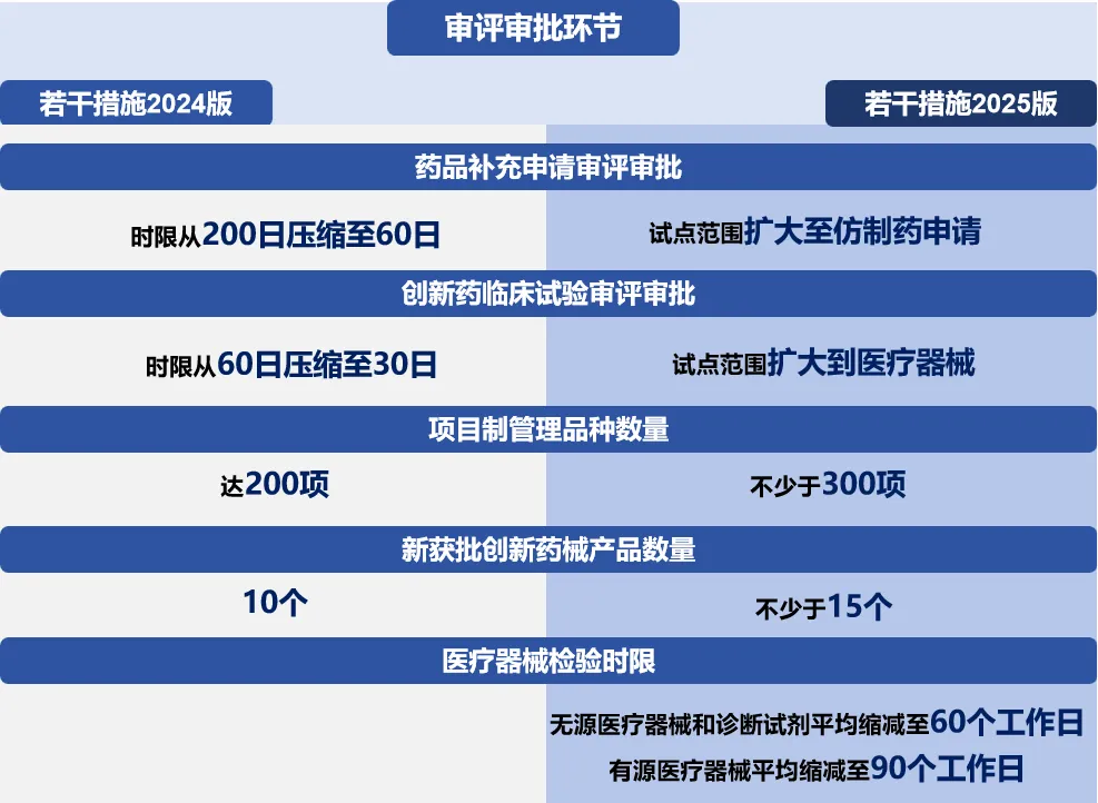 臨床試驗審評審批方面,持續(xù)深化國家藥監(jiān)局相關試點工作,將優(yōu)化創(chuàng)新藥臨床試驗審評審批試點擴大到醫(yī)療器械,將藥品補充申請審評審批試點爭取擴大至仿制藥申請。藥械檢驗檢測能力方面,首次明確提出提效量化目標,推動實現(xiàn)無源醫(yī)療器械和診斷試劑平均縮減至60個工作日、有源醫(yī)療器械平均縮減至90個工作日,持續(xù)保持醫(yī)療器械檢驗能力全國領先地位。針對臨床急需藥械產(chǎn)品,在全國率先實現(xiàn)即收即檢。項目制管理方面,持續(xù)擴大服務范圍和對象,較2024年新增納入項目制服務藥械品種數(shù)量100項,累計達300項。多項舉措助力藥械產(chǎn)品上市“加速度”,實現(xiàn)2025年新獲批創(chuàng)新藥械產(chǎn)品數(shù)量不少于15個。