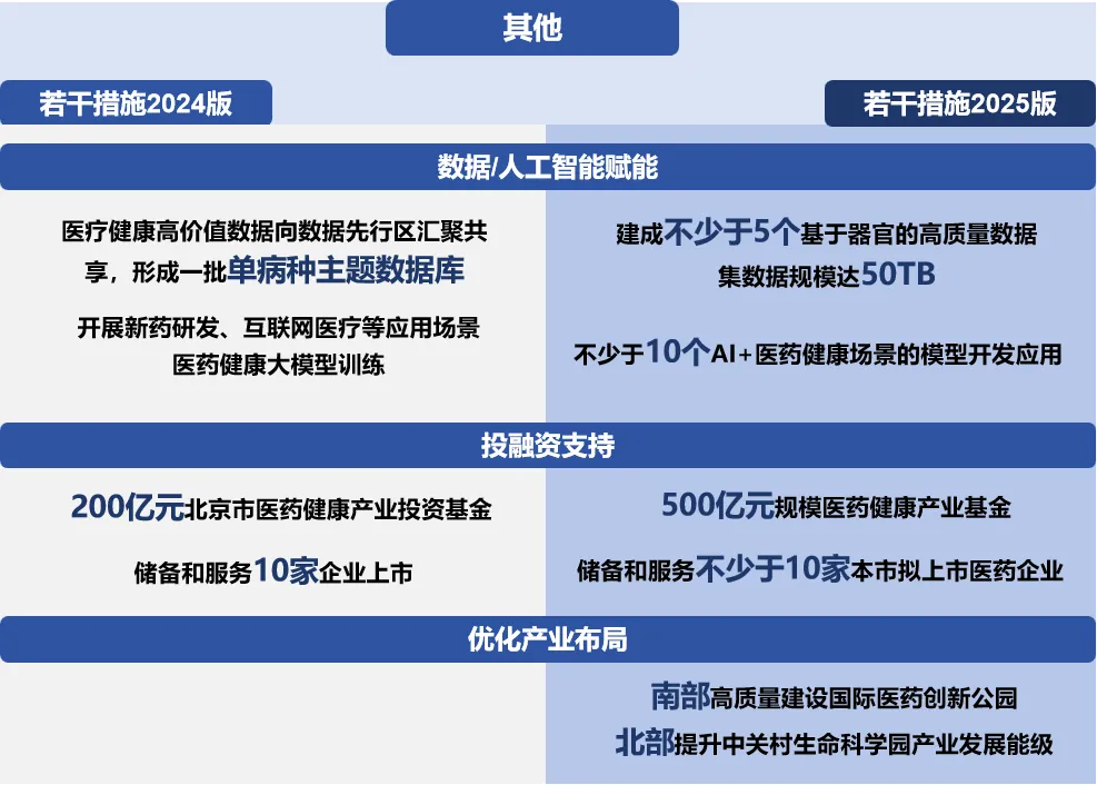 《若干措施2025版》為進一步加強對創(chuàng)新藥械研、產(chǎn)、審、用全鏈條政策支持,構建500億元規(guī)模醫(yī)藥健康產(chǎn)業(yè)基金加強投融資支持,包括新設100億元規(guī)模醫(yī)藥并購基金,發(fā)揮市級200億元、區(qū)級100億元兩級生物醫(yī)藥投資基金協(xié)同作用,帶動100億元規(guī)模社會基金,制定更包容、更體現(xiàn)創(chuàng)業(yè)友好型特征的相關制度,投早投小投長期,持續(xù)賦能創(chuàng)新藥、創(chuàng)新醫(yī)療器械高質量發(fā)展。